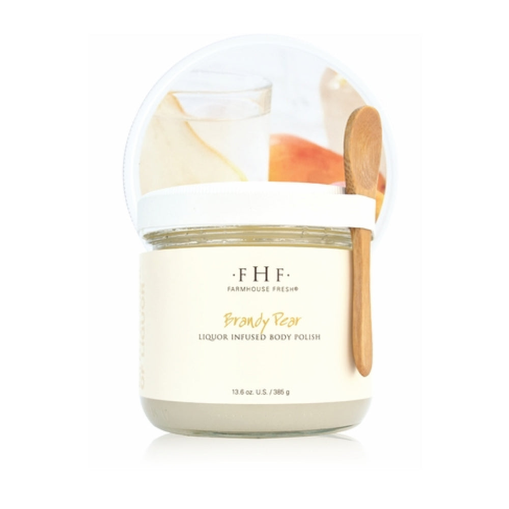 It takes 1 pound of pears, crushed and fermented, to help distill the brandy in each jar of Brandy Pear Body Polish. This scrub also includes fine grain sea salt and rice bran oil – so not only are you left fragrant, but extremely soft with a glistening finish on your skin.