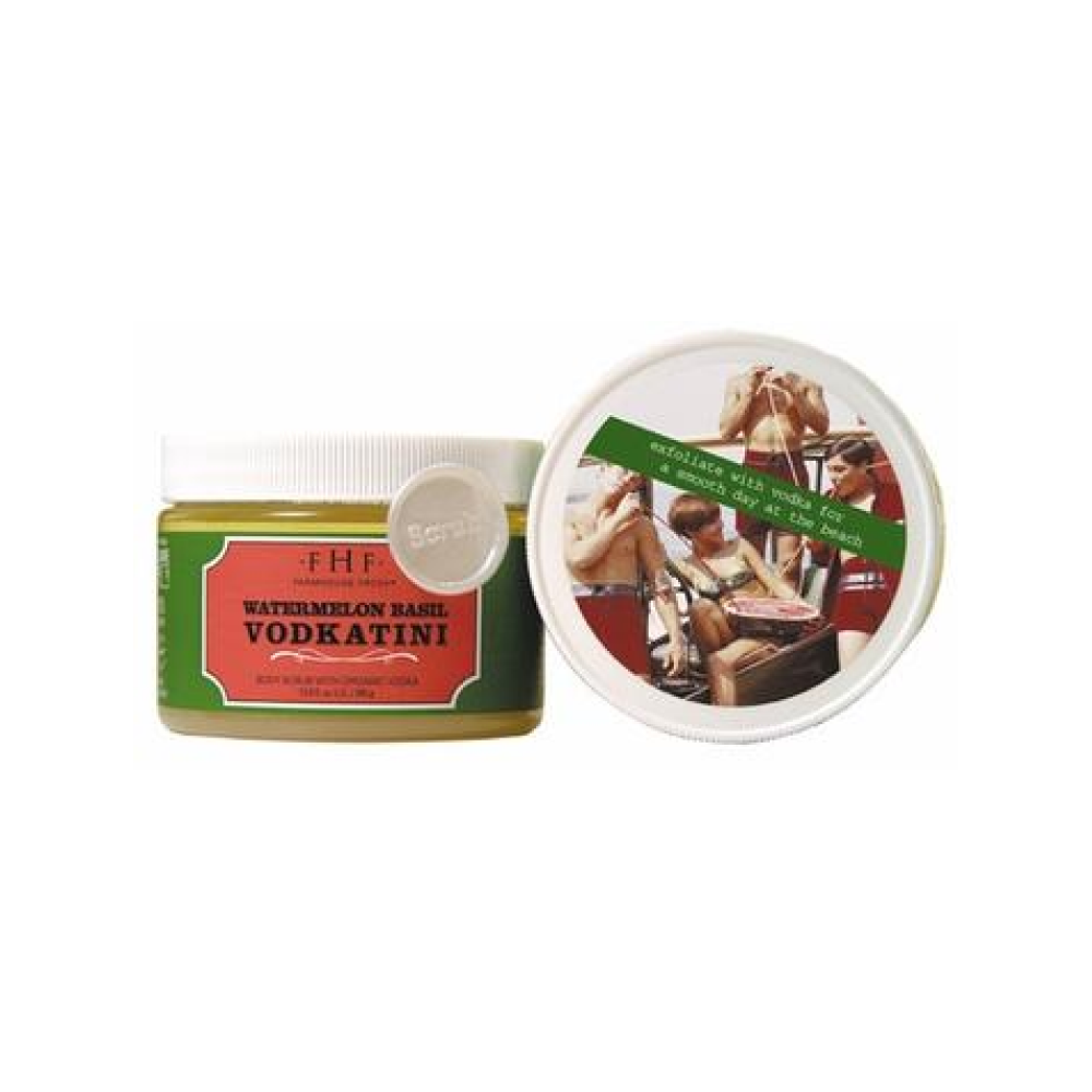 Prepare yourself for a juicy slice of delight! This fresh cocktail body polish combines Square One brand organic vodka, basil and watermelon seed oils with sugar and rice bran oil - for a luscious and refreshing exfoliation that renews your skin and leaves an absolutely tempting scent in its wake. Watermelon-Basil Vodkatini Body Scrub is 97% natural, and like all FarmHouse Fresh products, is Paraben & Sulfate free!
